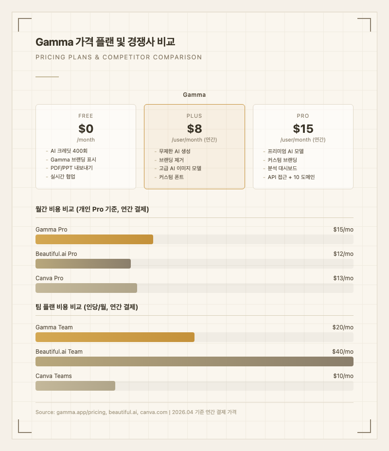 Gamma는 프리미엄(Freemium) + 크레딧 기반 모델을 사용한다. 무료 플랜은 AI 크레딧 400회를 제공하며, 프레젠테이션 약 10개 분량이다. 무료로 만든 모든 결과물에는 Gamma 브랜딩이 표시된다.