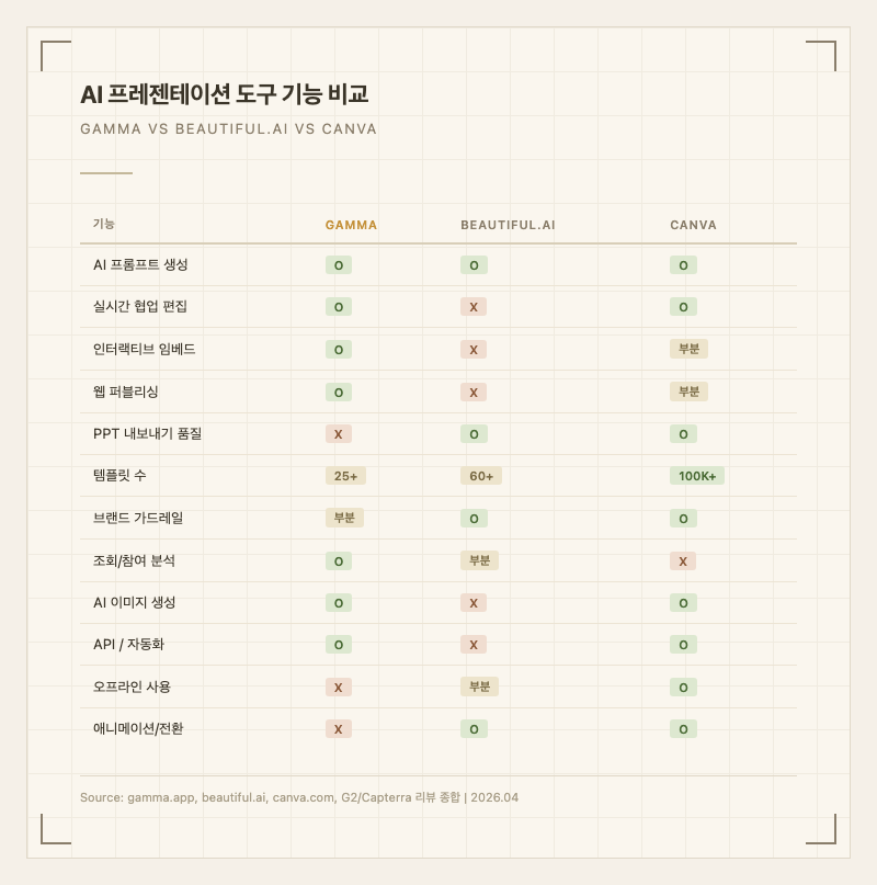 PPT 내보내기 품질에서는 Beautiful.ai가 확실히 앞선다. Gamma의 카드 기반 세로 레이아웃은 표준 16:9 슬라이드로 변환할 때 텍스트가 밀리고, 웹 폰트가 대체되며, 이미지 위치가 어긋나는 문제가 빈번하다. Beautiful.ai는 PPT 네이티브 출력이라 이런 문제가 거의 없다 (Prezent 리뷰, Reddit).