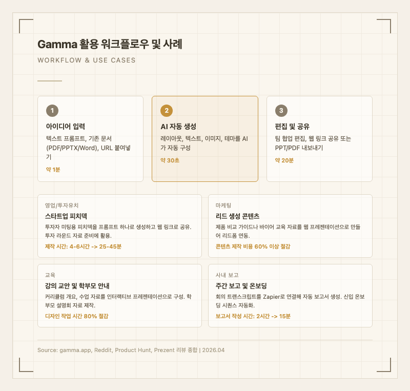 교사들이 학기 초 학부모 설명회(Back-to-School Night) 자료, 커리큘럼 개요, 수업 교안을 Gamma로 만들어 웹 링크로 배포하는 사례가 있다. 인터랙티브 임베드로 유튜브 영상, 타임라인, 설문 양식을 프레젠테이션 안에 넣을 수 있어서 정적 PPT보다 학생 참여도가 높다. 디자인 작업에 소요되던 시간의 80%를 줄였다는 교육자 피드백이 있다 (gamma.app 프롬프트 라이브러리).