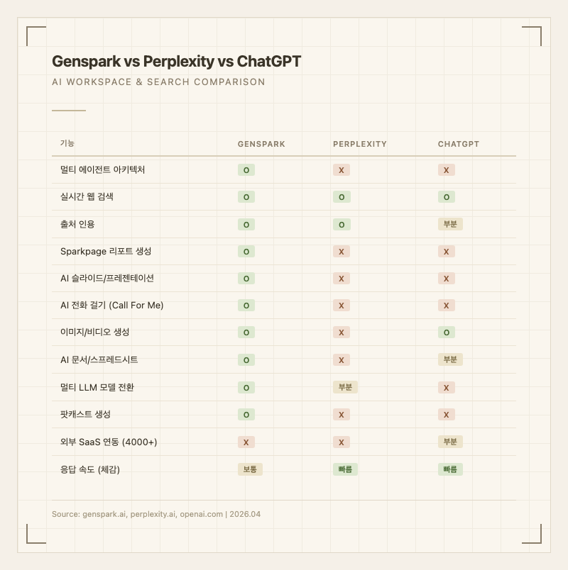 ChatGPT는 범용 대화형 AI로 가장 넓은 사용자층을 보유하고 있다. 텍스트 생성, 코딩, 이미지 생성 등 다양한 작업을 소화하지만 멀티스텝 자동화에는 제한이 있다. Genspark의 Super Agent는 하나의 프롬프트로 웹 검색 - 정보 분석 - 전화 예약 - 슬라이드 생성까지 연쇄적으로 실행할 수 있는 반면, ChatGPT는 각 작업을 개별 대화로 처리해야 한다. ChatGPT는 출처 인용이 부분적이고, Genspark는 Sparkpage에서 모든 정보에 출처 링크를 달아준다. ChatGPT Plus는 $20/월로 Genspark보다 저렴하고, 플러그인 생태계가 더 넓다.