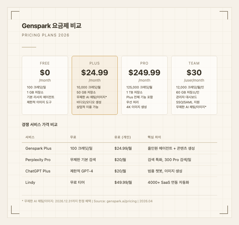Genspark는 Free, Plus, Pro, Team 4개 플랜을 제공한다.