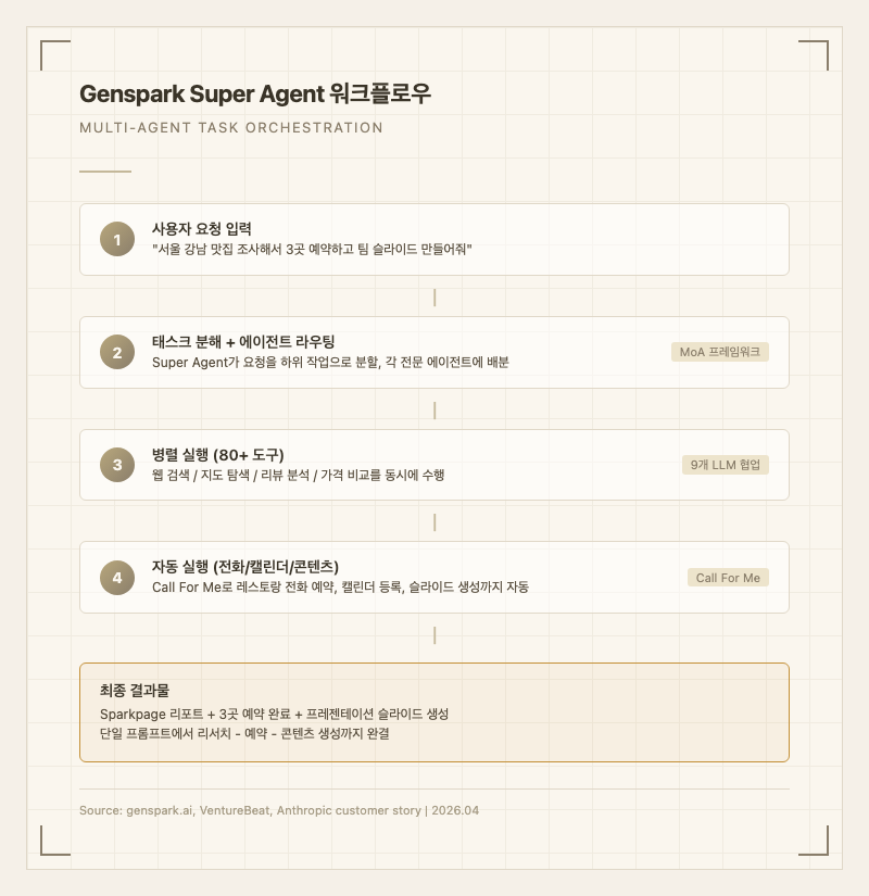 Genspark는 멀티 에이전트 아키텍처 기반의 올인원 AI 워크스페이스다. 여러 AI 모델(GPT-5, Claude, Gemini 등 9개 LLM)이 협업하는 Mixture-of-Agents(MoA) 프레임워크 위에서 검색, 콘텐츠 생성, 전화 자동화, 데이터 분석까지 하나의 플랫폼에서 처리한다. 2024년 6월 출시 이후 빠르게 기능을 확장해 단순 AI 검색 엔진에서 Super Agent 기반 자율 작업 플랫폼으로 진화했다.