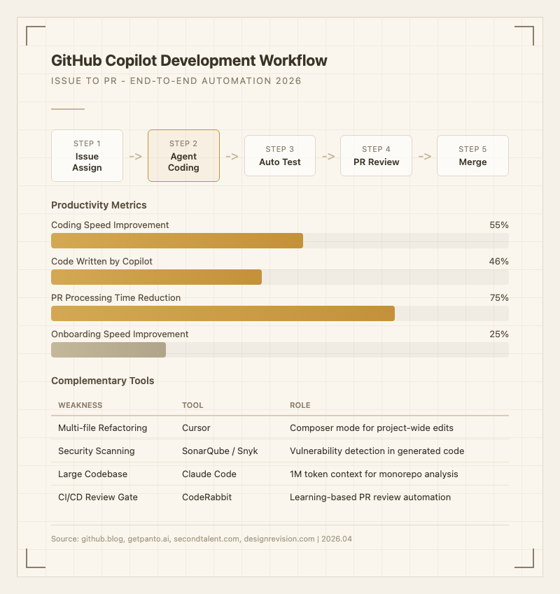 종합 생산성 지표 - GitHub 자체 연구에 따르면 Copilot 사용자는 코딩 작업을 55% 더 빠르게 완료한다. PR 처리 시간은 평균 9.6일에서 2.4일로 4배 단축되었다. 새 코드베이스에 합류한 개발자의 온보딩 속도는 25% 빨라졌다. 2026년 기준 활성 사용자가 생성하는 코드의 약 46%가 Copilot이 작성한 것이다 (getpanto.ai, secondtalent.com).