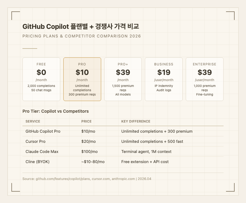 Free 플랜은 월 2,000회 자동완성과 50회 채팅이 제한이다. 개인 프로젝트나 가벼운 취미 코딩에는 충분하지만, 실무에서 하루 이틀이면 소진된다. Pro($10/월)로 올리면 자동완성이 무제한이 되고 프리미엄 요청 300회가 주어진다. 이 300회는 Chat, Agent Mode, Code Review, CLI 사용을 모두 포함하며, 고급 모델(GPT-4.5 등)은 1회에 50배 크레딧을 소모하므로 실질적 한도는 모델 선택에 따라 크게 달라진다.