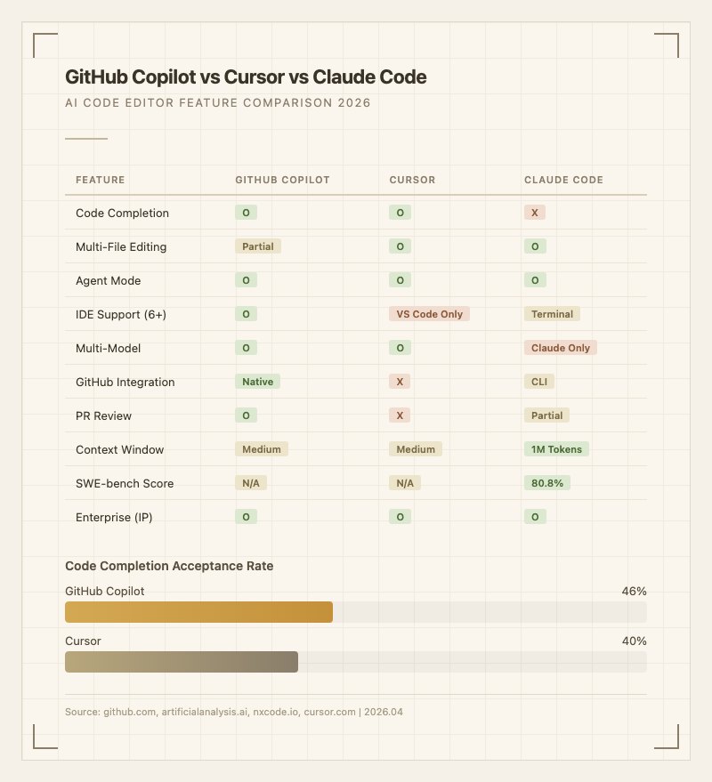 Claude Code는 터미널 네이티브 에이전트로, 접근 방식 자체가 다르다. 100만 토큰 컨텍스트 윈도우로 대규모 코드베이스 전체를 한 번에 이해할 수 있어서, SWE-bench Verified에서 80.8%로 최고 성적을 기록했다 (artificialanalysis.ai). Copilot은 벤치마크 점수를 공개하지 않지만, 단일 파일 수준의 자동완성에서는 Claude Code보다 빠르고 자연스럽다. 핵심 차이는 통합 범위다. Copilot은 GitHub 이슈 할당부터 코딩 에이전트 실행, PR 리뷰, PR 요약까지 GitHub 생태계 전체와 네이티브로 연결된다. Claude Code는 Anthropic Claude 모델만 사용 가능하지만, Copilot은 GPT-4o, Claude, Gemini 등 복수 모델을 선택할 수 있다 (공식 문서).