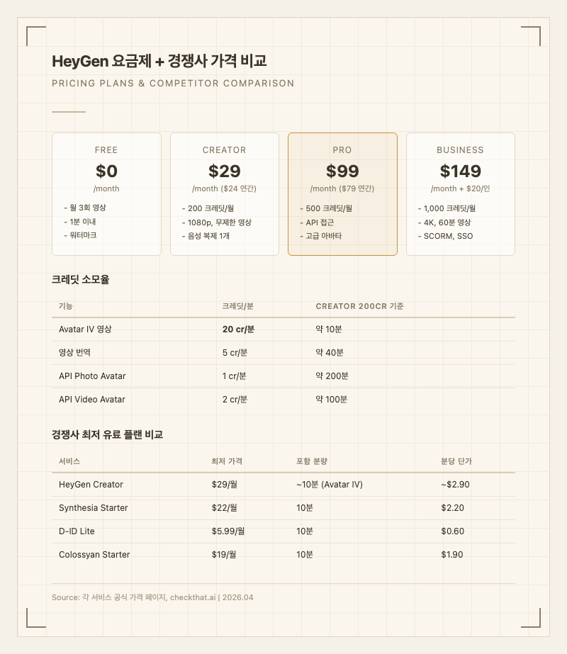 HeyGen은 Free, Creator, Pro, Business, Enterprise 5단계 요금제를 운영한다.