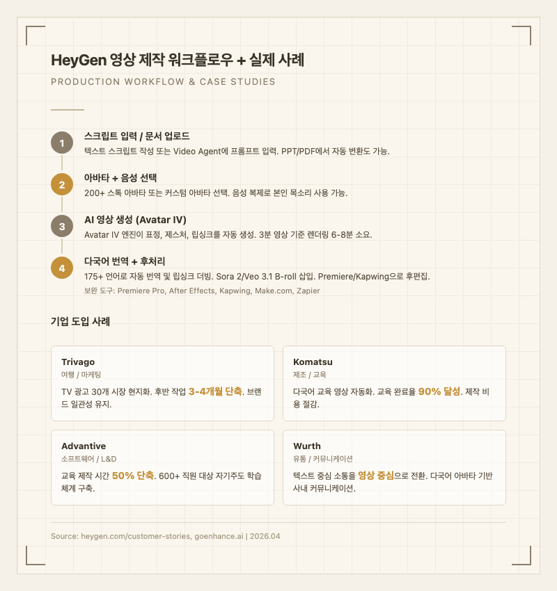 Trivago의 경우 HeyGen으로 30개 시장용 현지화 영상 원본을 생성한 후 자체 후반 작업 파이프라인에 투입하는 방식을 사용했고, 이 과정에서 기존 대비 후반 작업 기간을 3-4개월 단축했다.