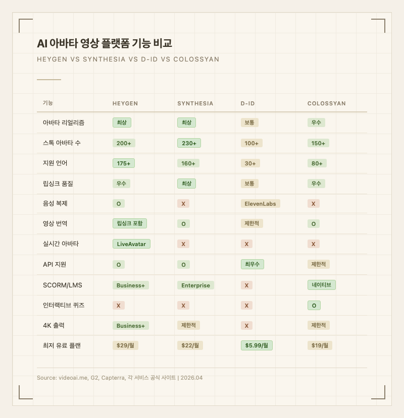 D-ID는 $5.99/월이라는 업계 최저가 진입점을 가진다. 하지만 아바타 품질에서 확실한 차이가 있다. D-ID의 아바타는 "인식 가능한 수준의 AI" 수준이고, 주변 얼굴 애니메이션이 덜 정교하다 (videoai.me). 일본어나 아랍어 같은 언어에서 립싱크가 눈에 띄게 무너진다. 반면 API 측면에서는 D-ID가 성숙하고 문서화가 잘 되어 있어서 개발자 친화적이다. HeyGen과 D-ID는 타겟이 다르다. D-ID는 소량의 토킹 헤드 영상이 필요한 개발자/소규모 팀에 적합하고, HeyGen은 기업 규모의 다국어 영상 제작에 적합하다.