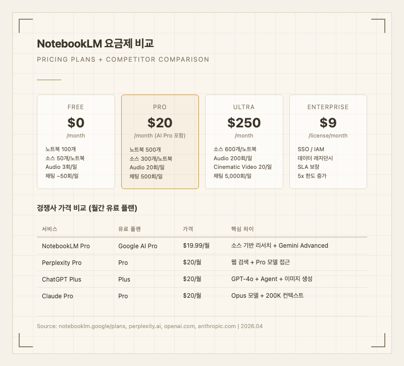 Pro(20 가격대에서 리서치 특화 기능(Audio/Video/슬라이드/인포그래픽)은 NotebookLM만 제공한다.