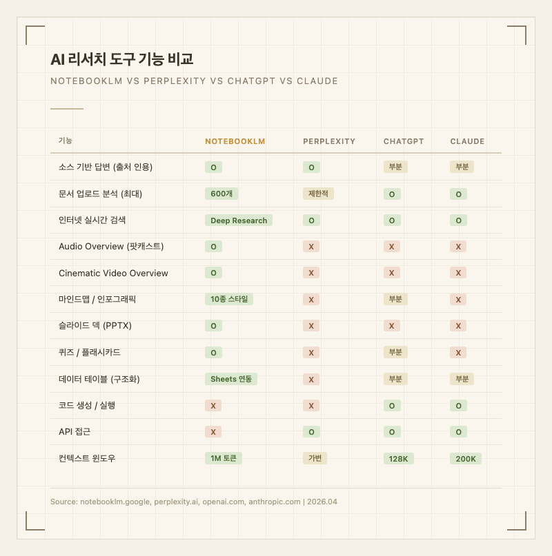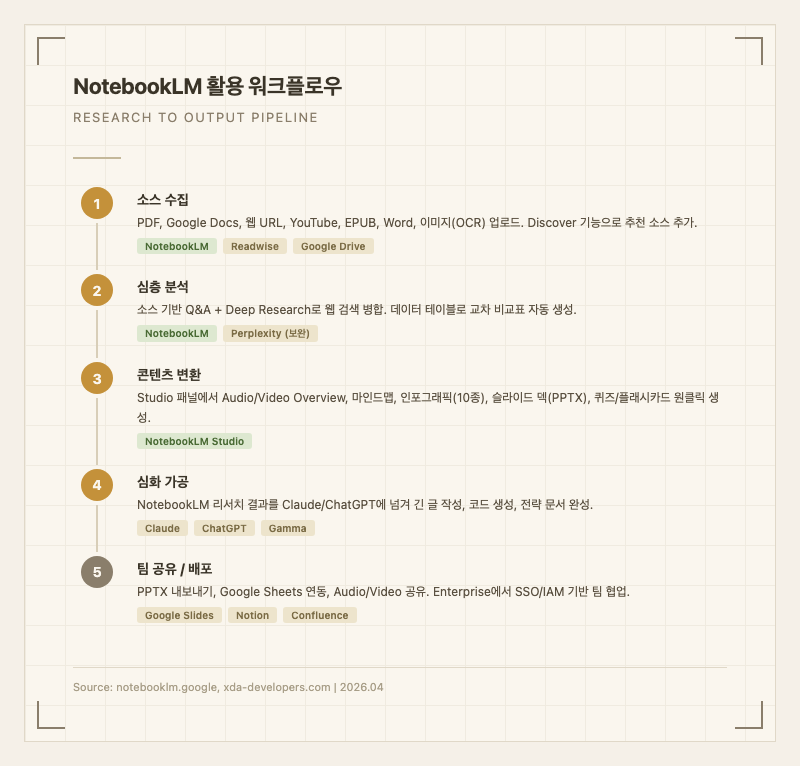 | 실시간 웹 리서치 | Perplexity | NotebookLM은 소스 중심, Perplexity는 최신 웹 정보 검색. Perplexity에서 찾은 소스를 NotebookLM에 추가하는 조합이 효과적 |