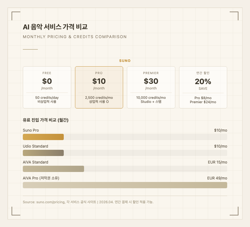 경쟁사 대비 가격 포지셔닝은 명확하다. Suno Pro 10/월이 동일 가격대에 상업적 사용권을 제공한다. AIVA는 Standard EUR 15/월이지만 상업적 사용이 제한적이고, 저작권 완전 소유를 원하면 Pro EUR 49/월이 필요하다. 보컬 포함 완성곡 기준으로 Suno의 가성비가 가장 높다.