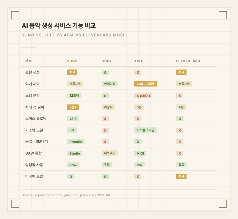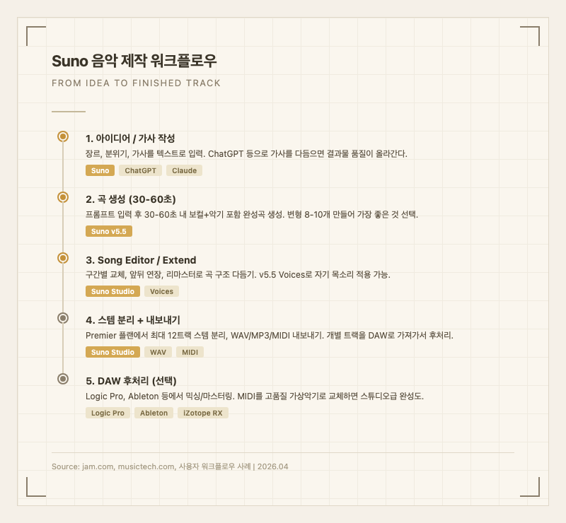 | 프로 프로듀서 | 정밀한 믹싱/마스터링, 악기별 세밀 제어 | 주의 - 악기 단위 제어가 부족. 아이디어 스케치 용도로만 활용하고 AIVA나 DAW로 마무리 |