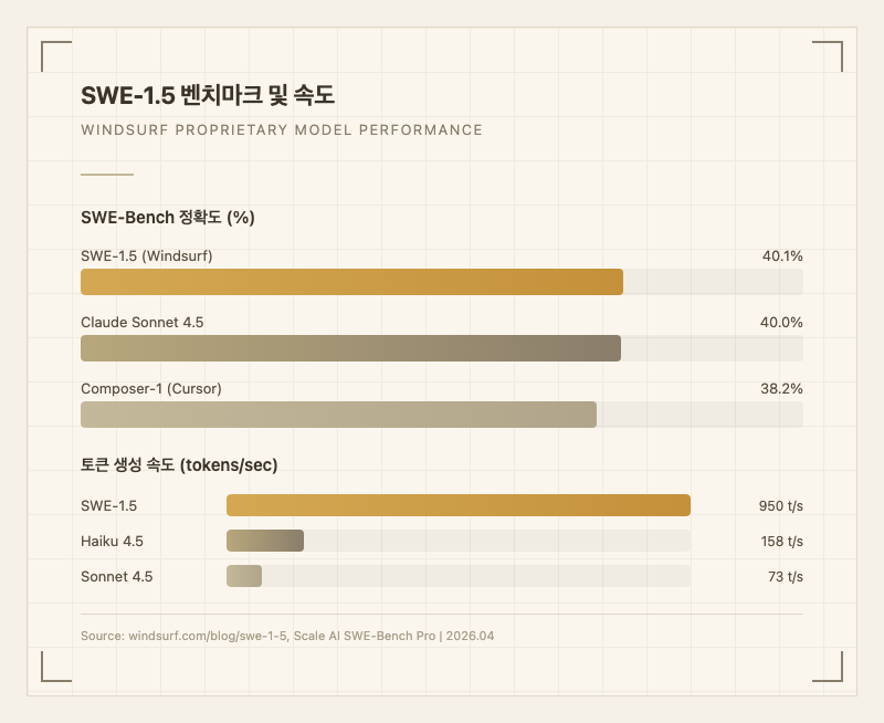 SWE-1.5 자체 코딩 모델: SWE-Bench에서 40.1% 정확도로 Claude Sonnet 4.5와 동등하면서, 토큰 생성 속도가 950 tokens/sec으로 Sonnet 대비 13배 빠르다. 에이전트 작업에서 대기 시간이 크게 줄어든다 (공식 블로그).