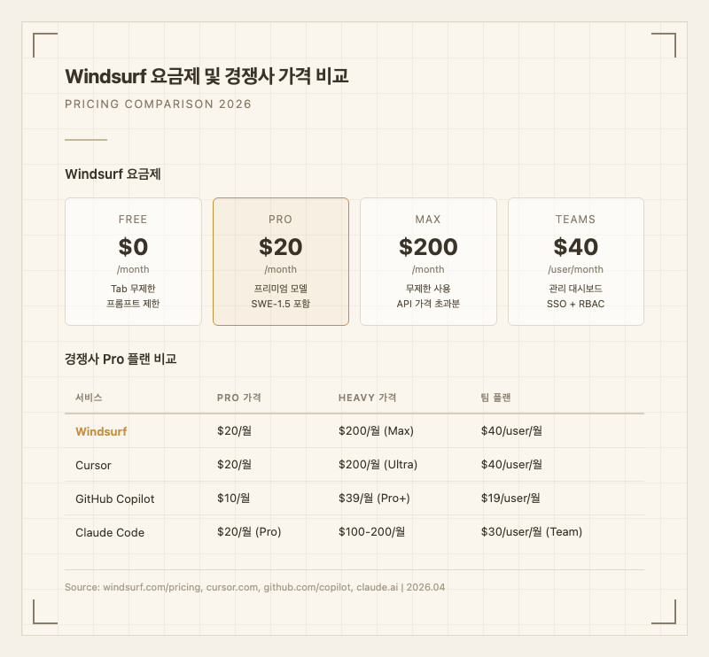경쟁사와 비교하면, Cursor와 Pro/Max 가격이 동일하고, GitHub Copilot이 Pro 39/월로 가장 저렴하다. 다만 Copilot의 에이전트 기능은 Windsurf나 Cursor에 비해 제한적이므로 단순 가격 비교는 의미가 제한적이다. Windsurf는 "Cursor의 80% 기능을 동일 가격에"라는 포지셔닝으로, 비용 대비 가장 균형 잡힌 선택지라는 평가를 받는다.