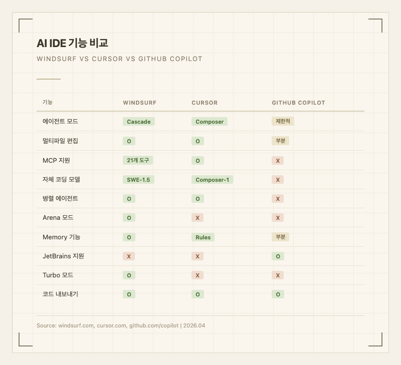 반면 에이전트 역량에서는 Windsurf가 크게 앞선다. Copilot은 멀티파일 편집, 병렬 에이전트, MCP 지원, 자체 코딩 모델 등이 없거나 제한적이다. 가격은 Copilot이 Pro 39/월로 더 저렴하지만, 에이전트 기능을 본격적으로 쓰려면 Windsurf나 Cursor로 가야 한다.